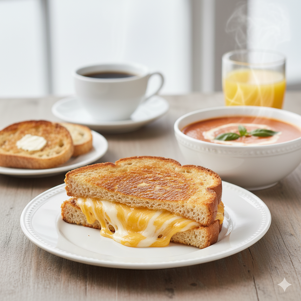 Golden, buttery grilled cheese with creamy tomato basil soup.